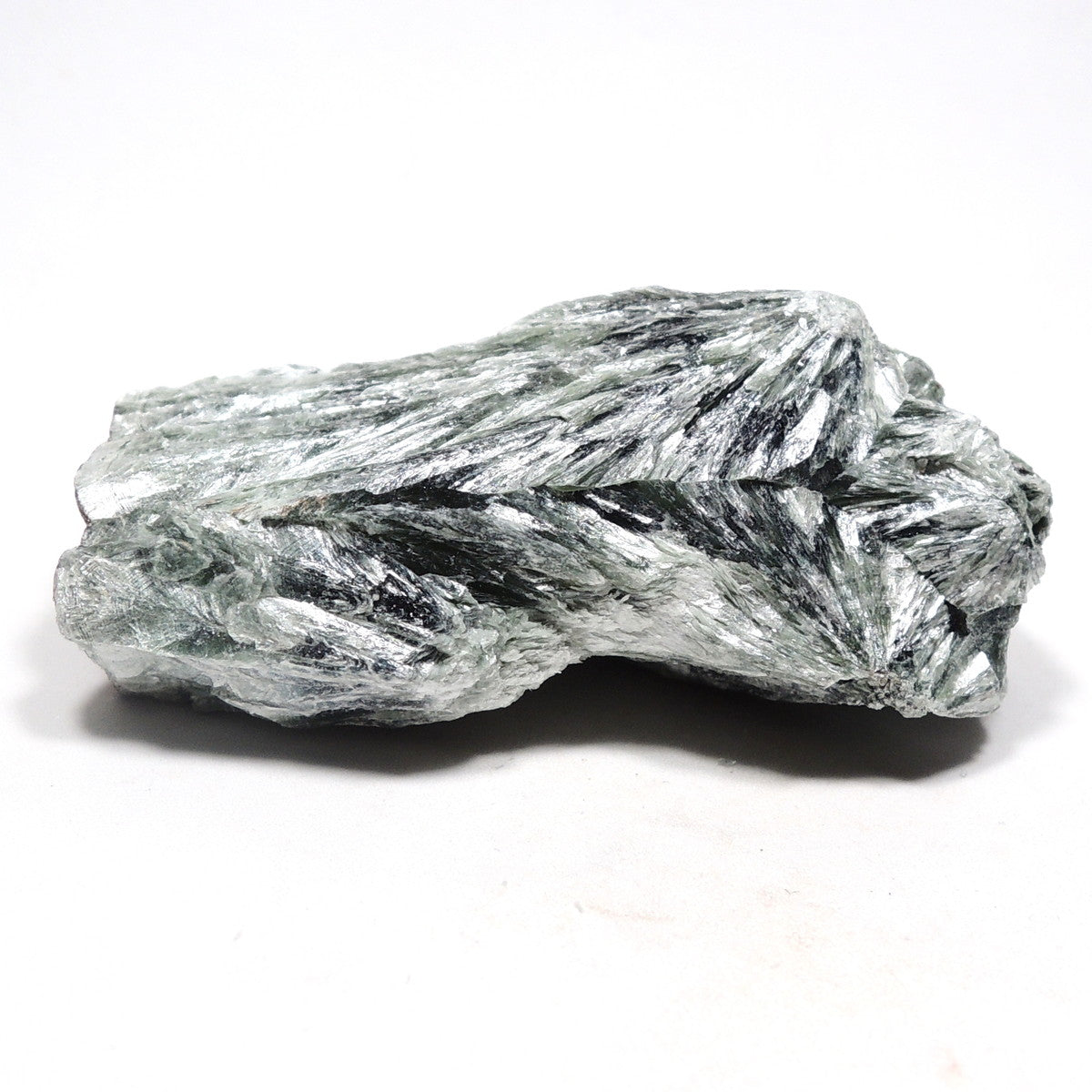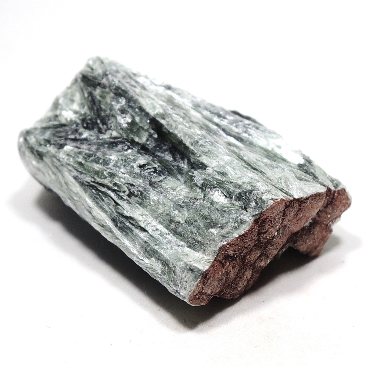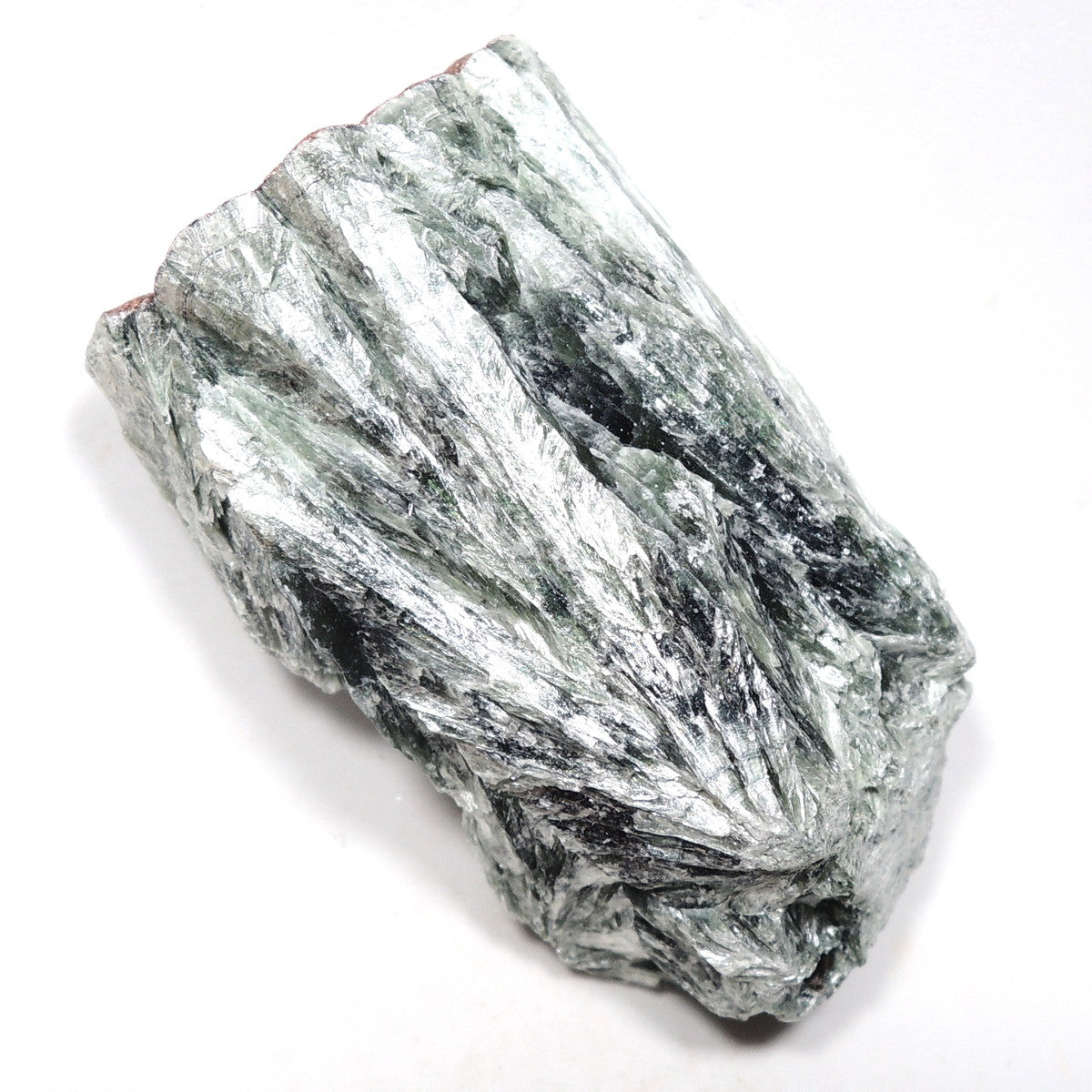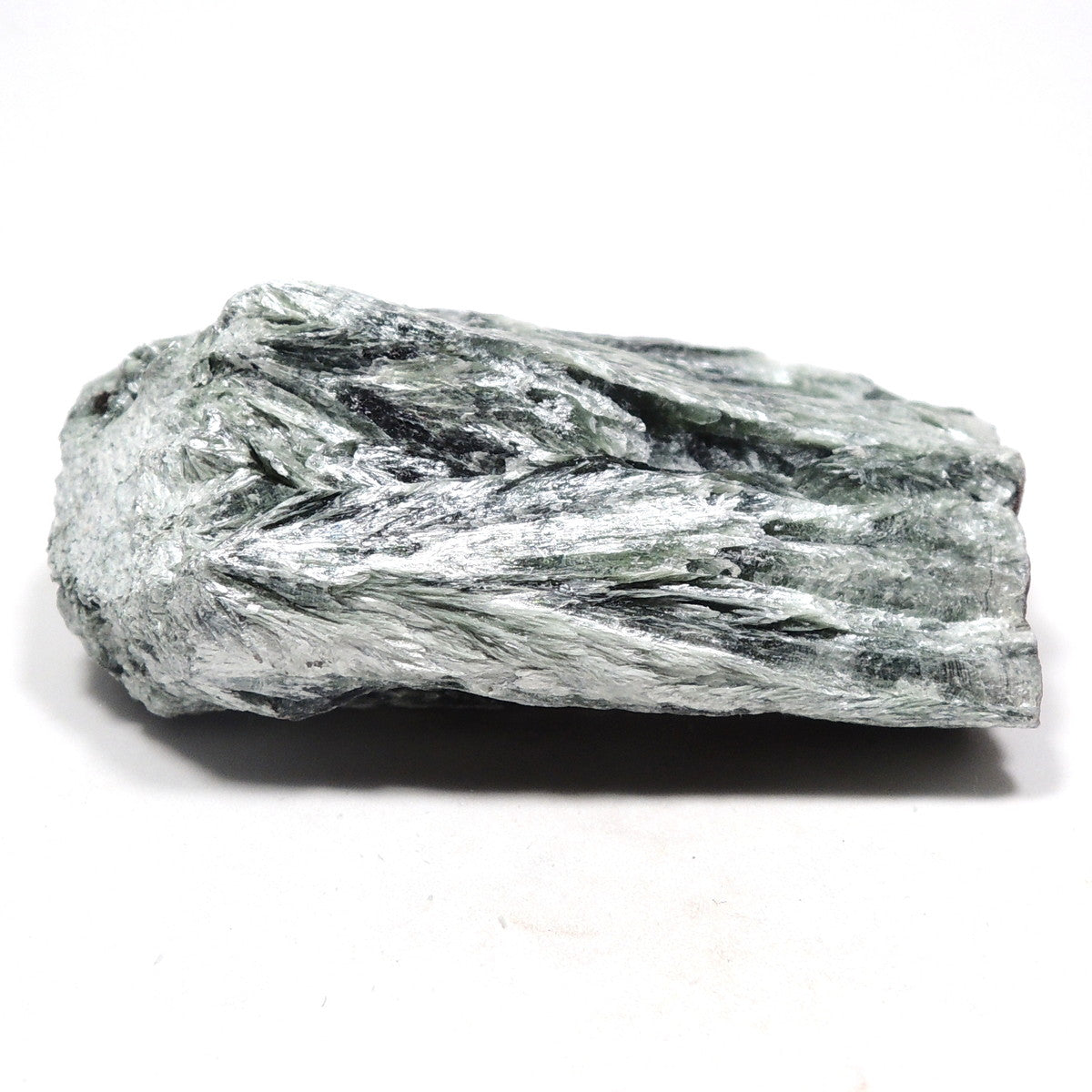 セラフィナイトの原石。「セラフィナイト」はコマーシャルネームで、正確にはクローライト(緑泥石)の一種であるクリノクロア(斜緑泥石)です。