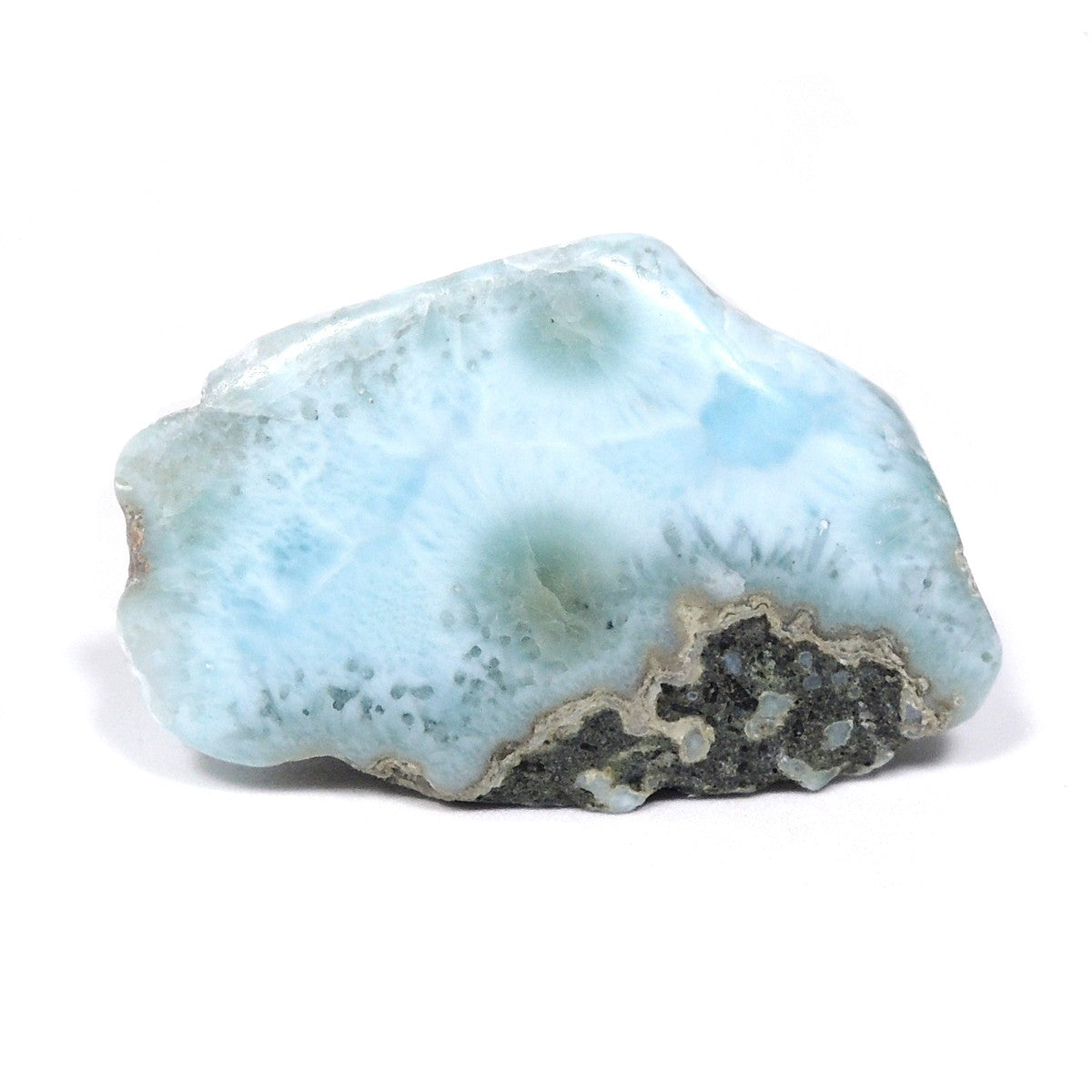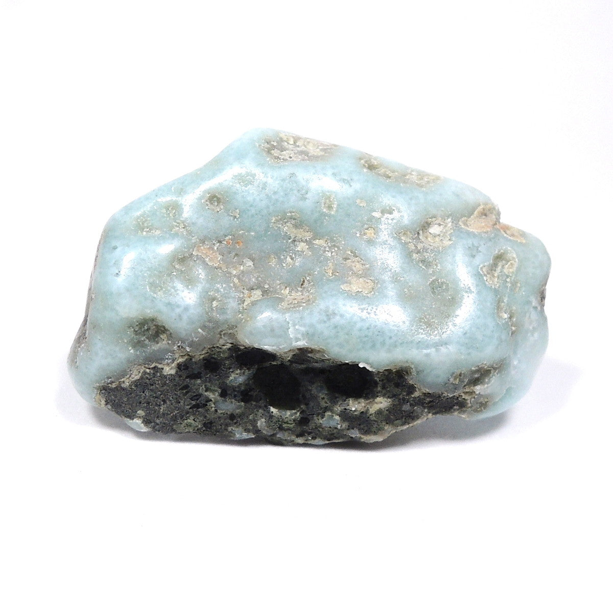 南の海をそのまま閉じ込めたような、ラリマーの標本。ラリマーとは、青色のペクトライト(曹達珪灰石)の呼称。ケイ酸塩鉱物の一種です。