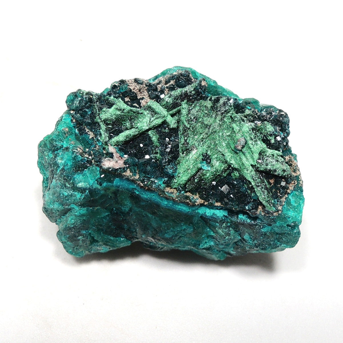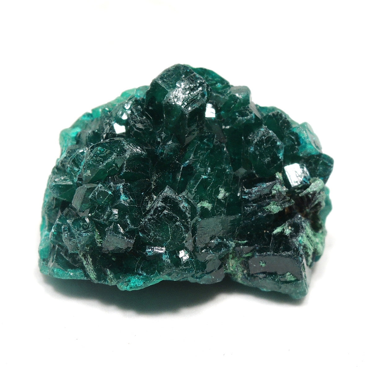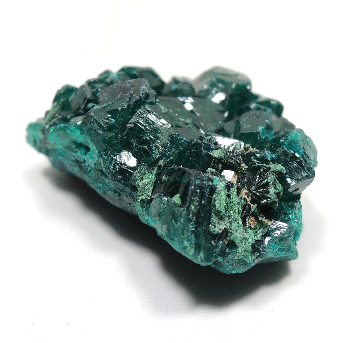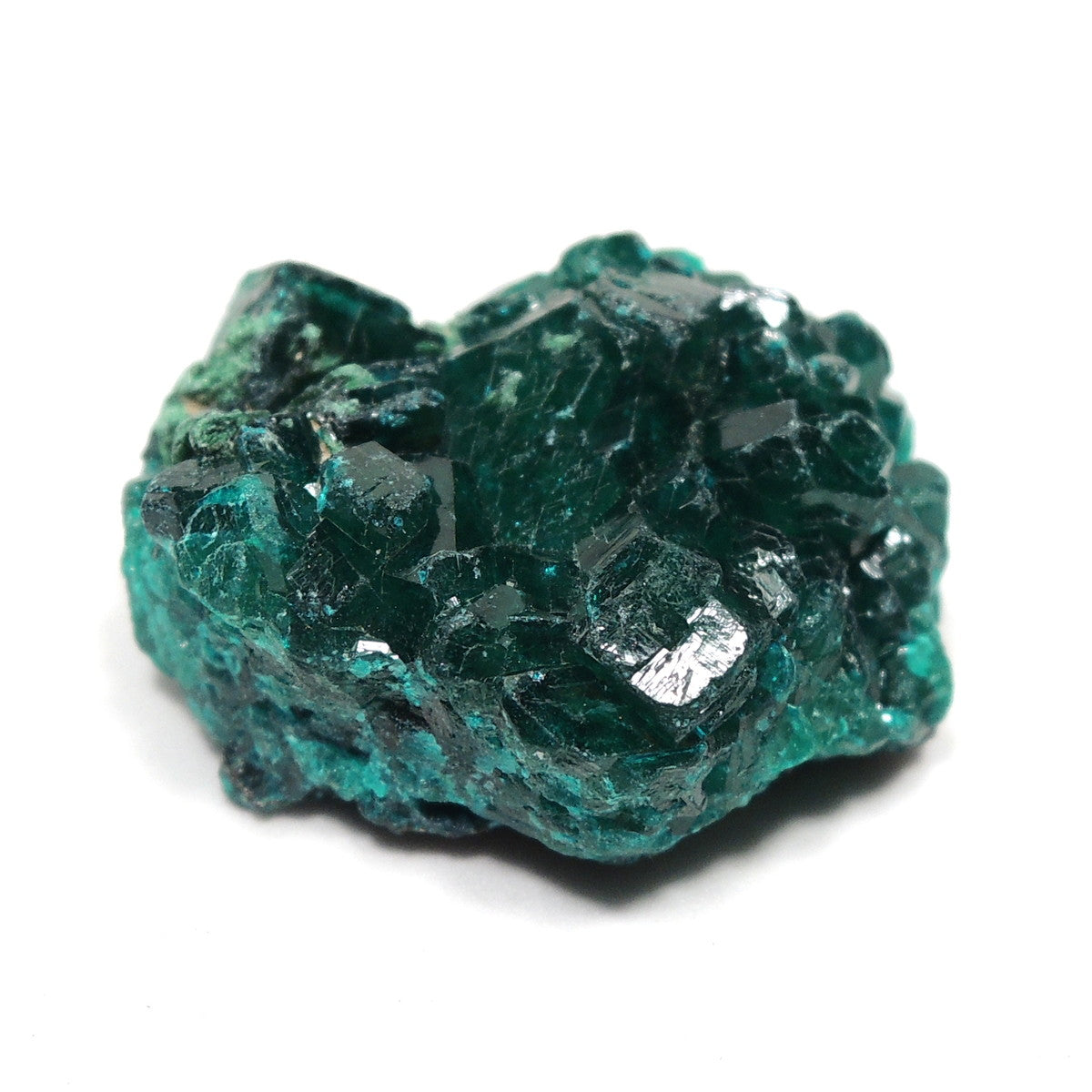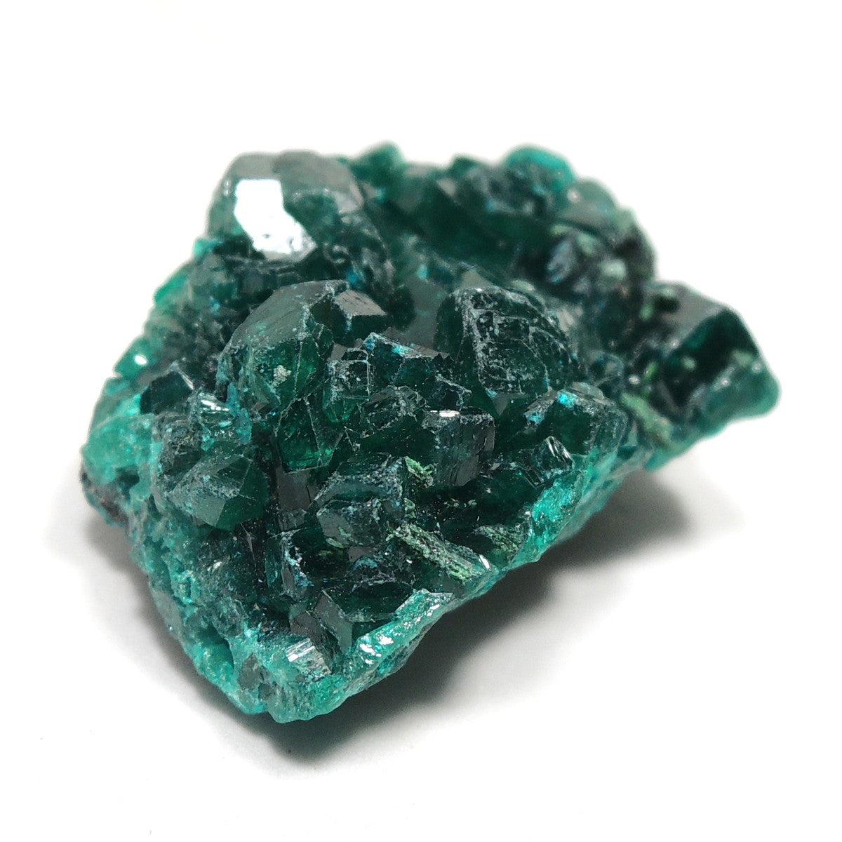 深い緑色の結晶が美しい、ダイオプテーズ(翠銅鉱)の標本。