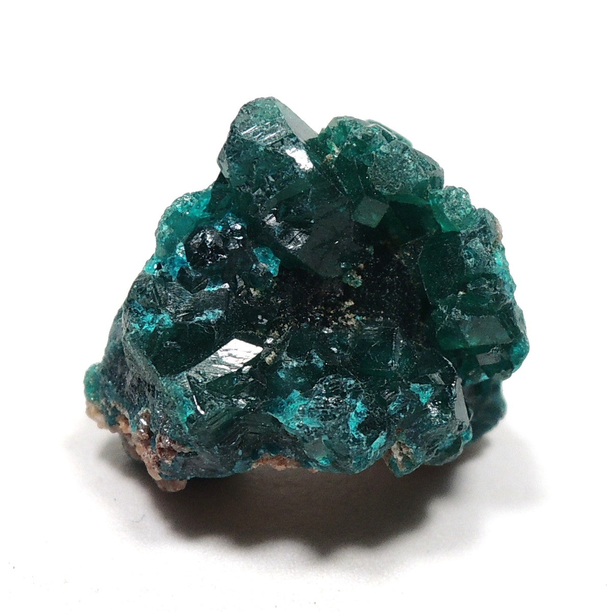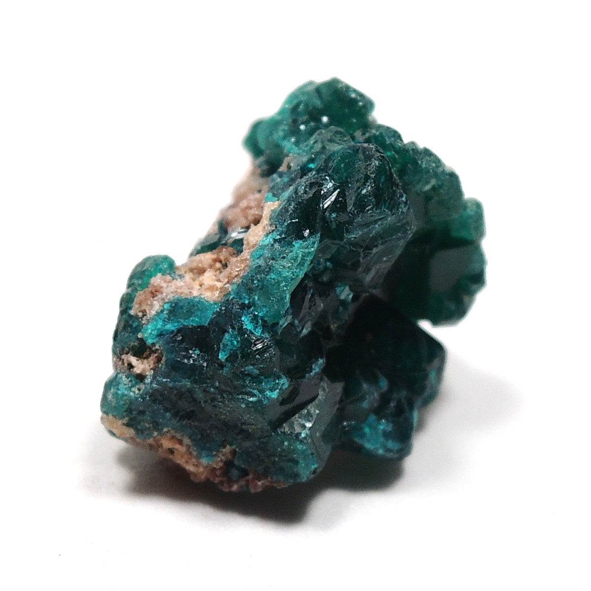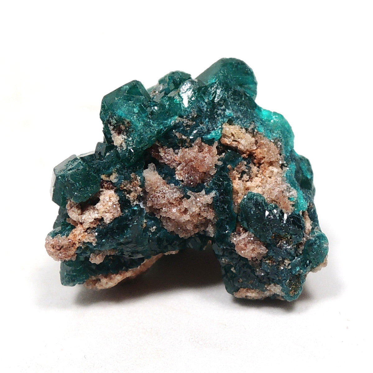 深い緑色の結晶が美しい、ダイオプテーズ(翠銅鉱)の標本。