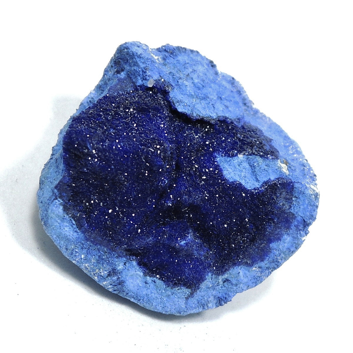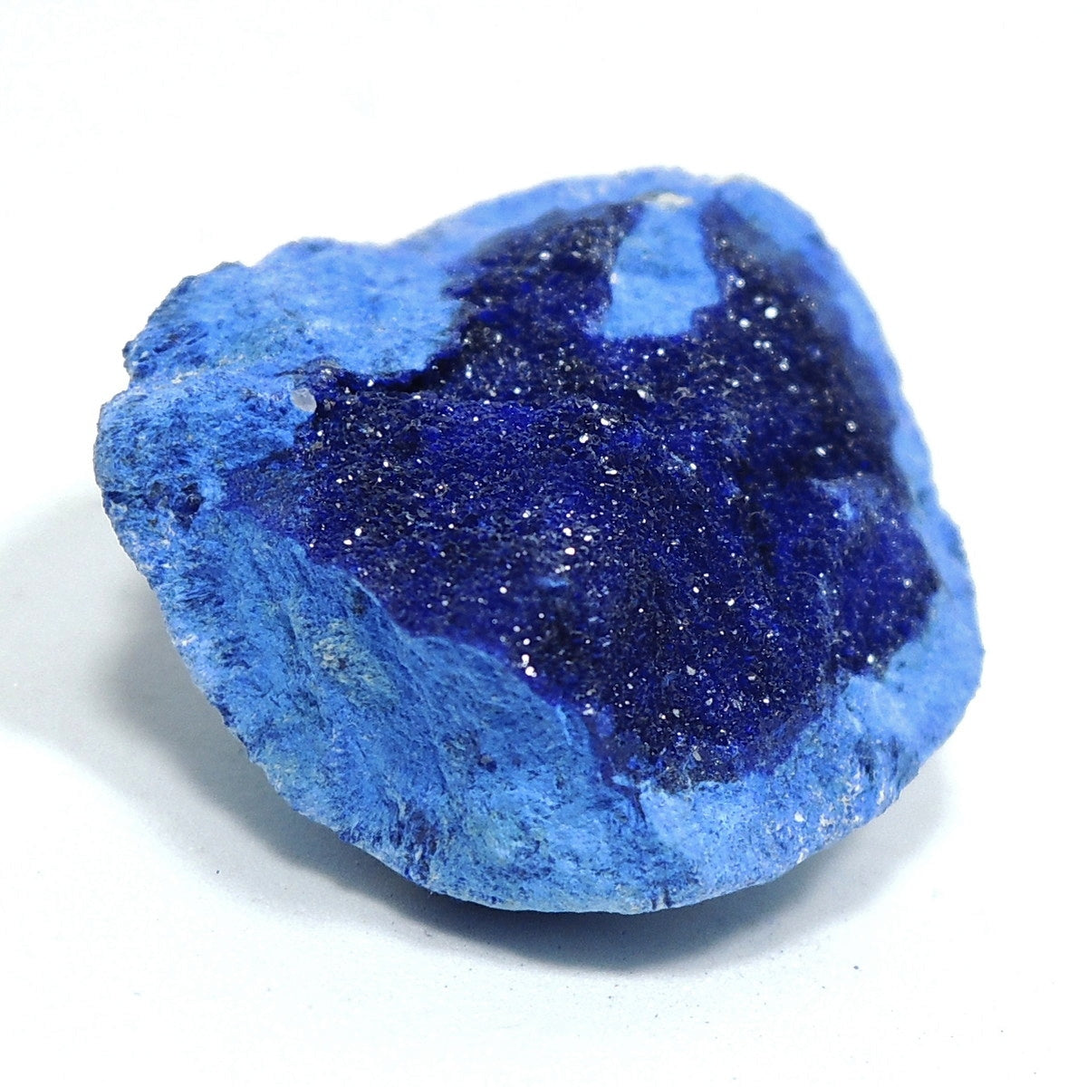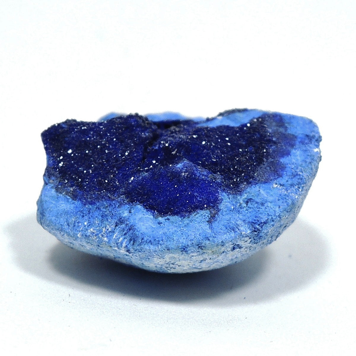 「アズライトボール」などと呼ばれる球状のアズライトを割ったものです。形状から、「アズライトジオード」「アズライトクラスター」とも。