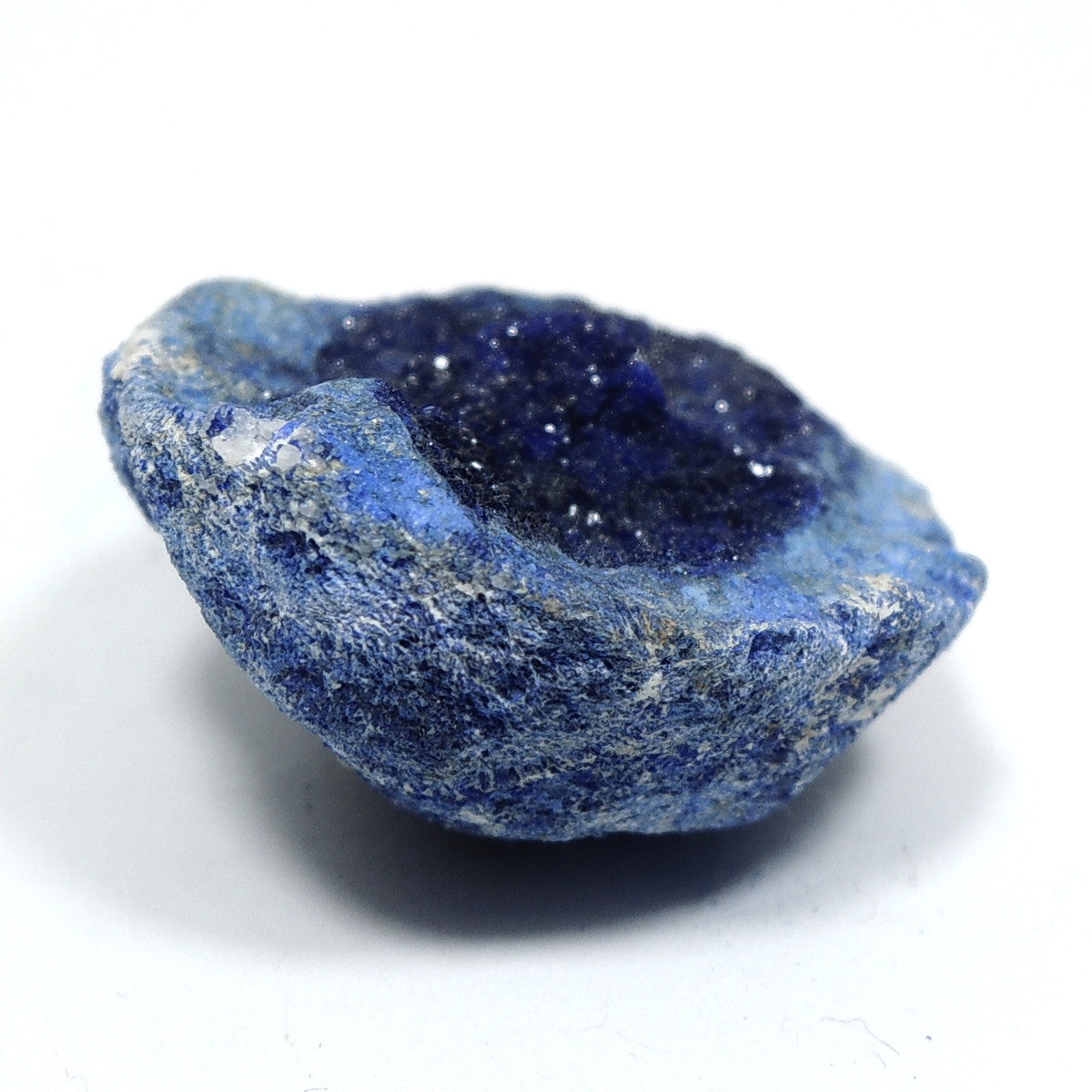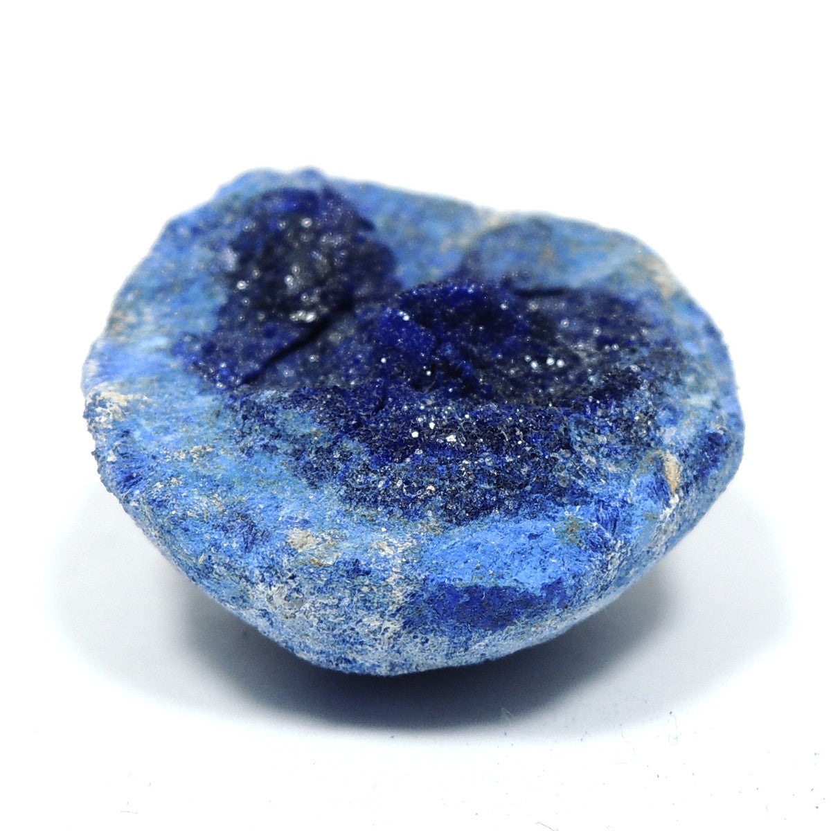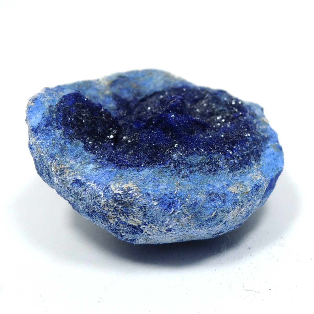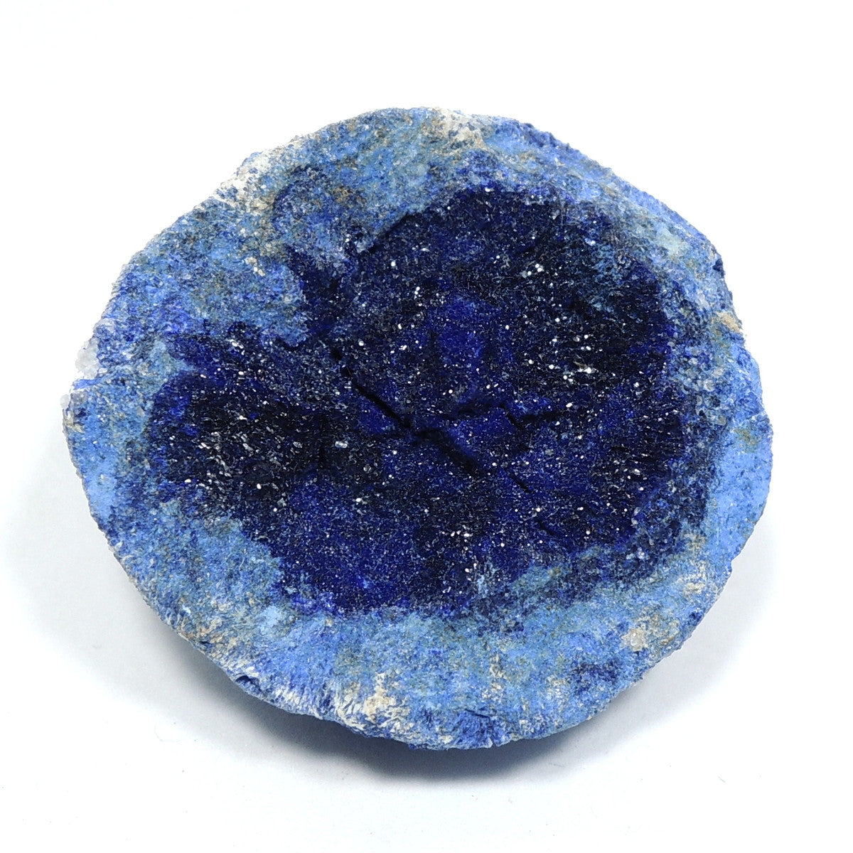 「アズライトボール」などと呼ばれる球状のアズライトを割ったものです。形状から、「アズライトジオード」「アズライトクラスター」とも。