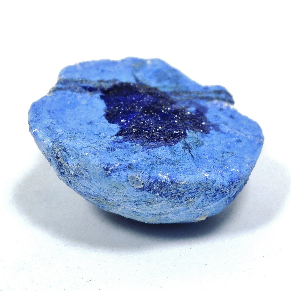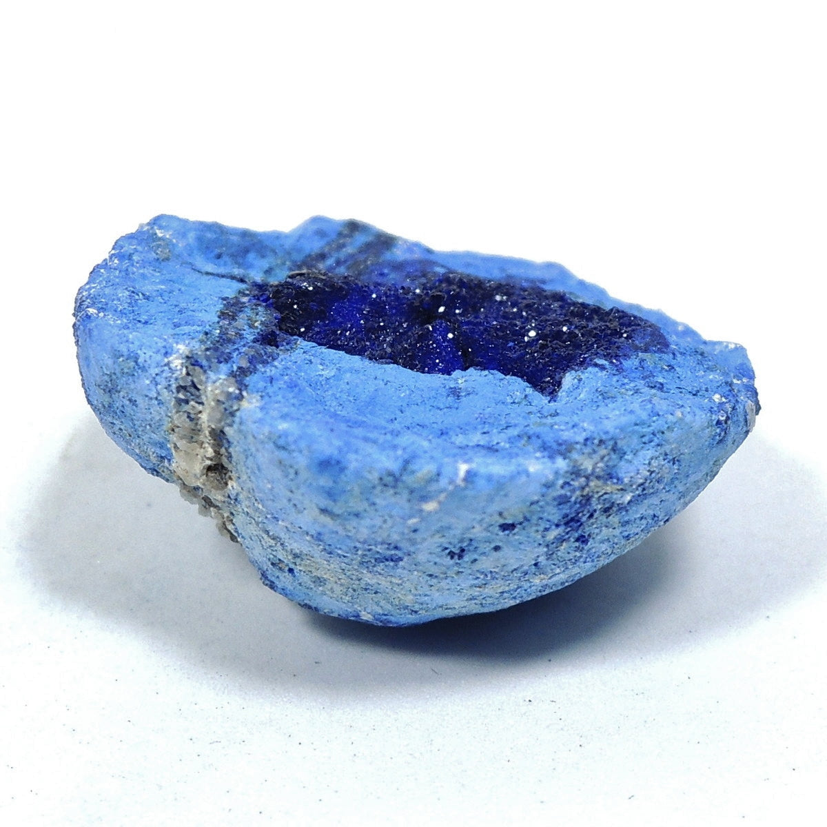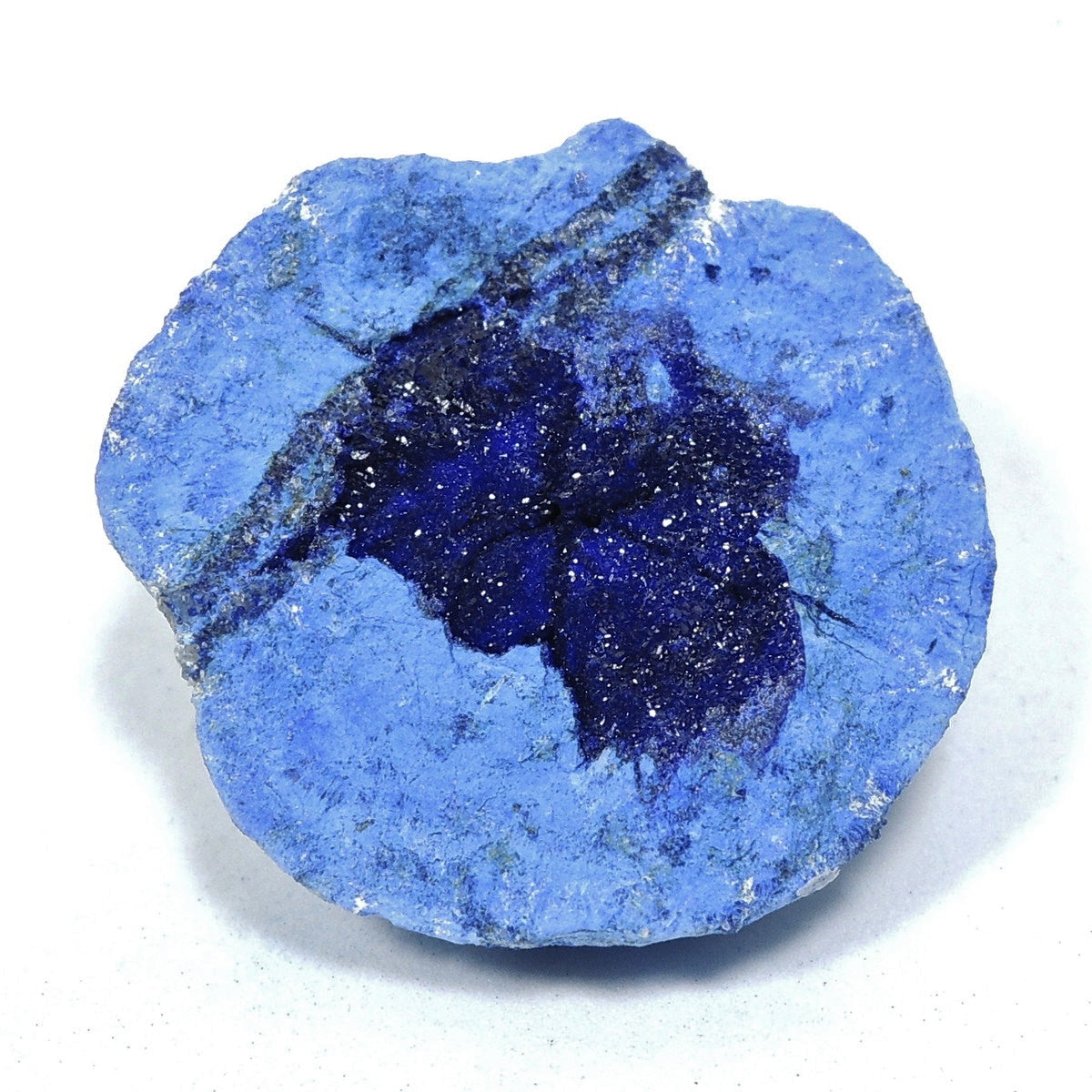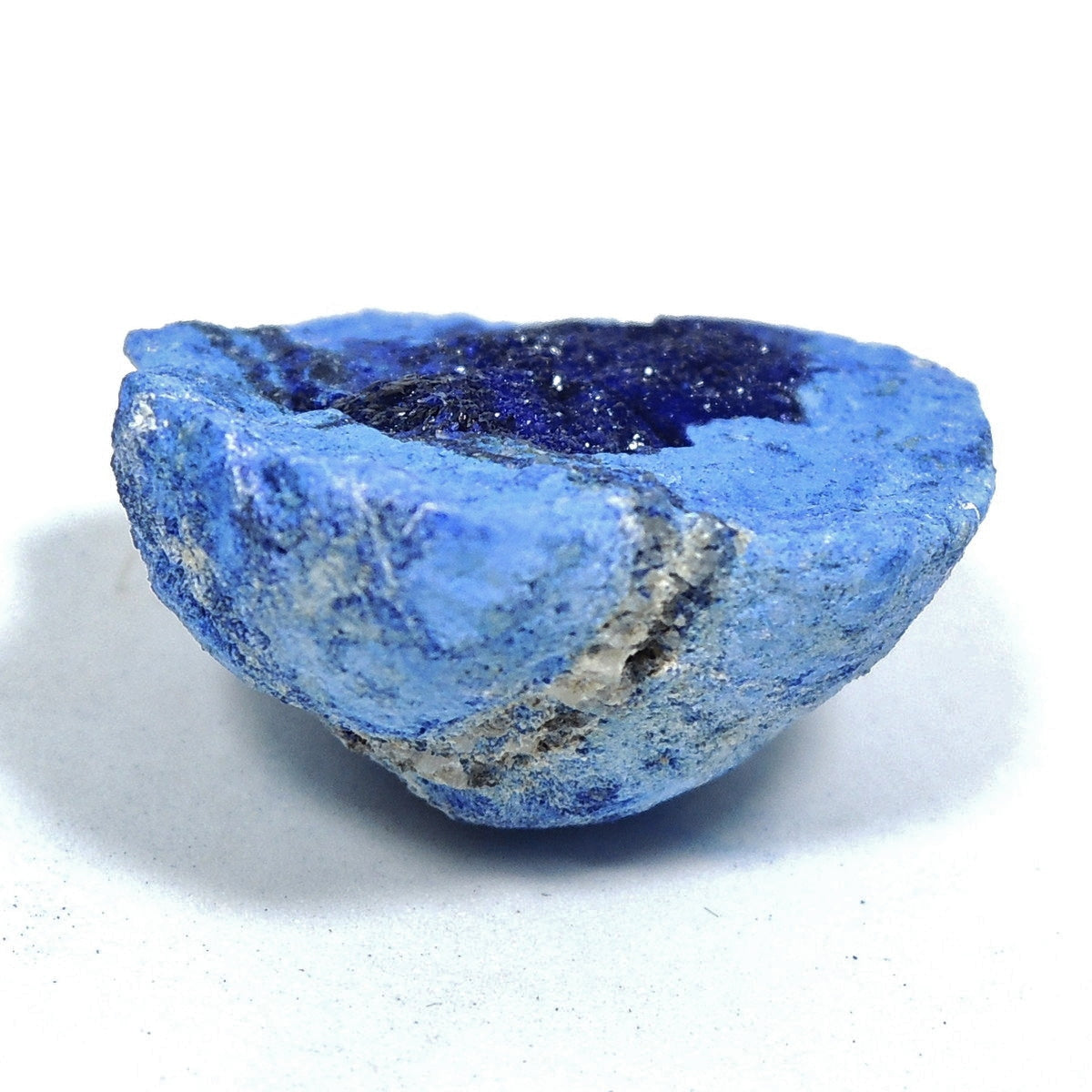 「アズライトボール」などと呼ばれる球状のアズライトを割ったものです。形状から、「アズライトジオード」「アズライトクラスター」とも。