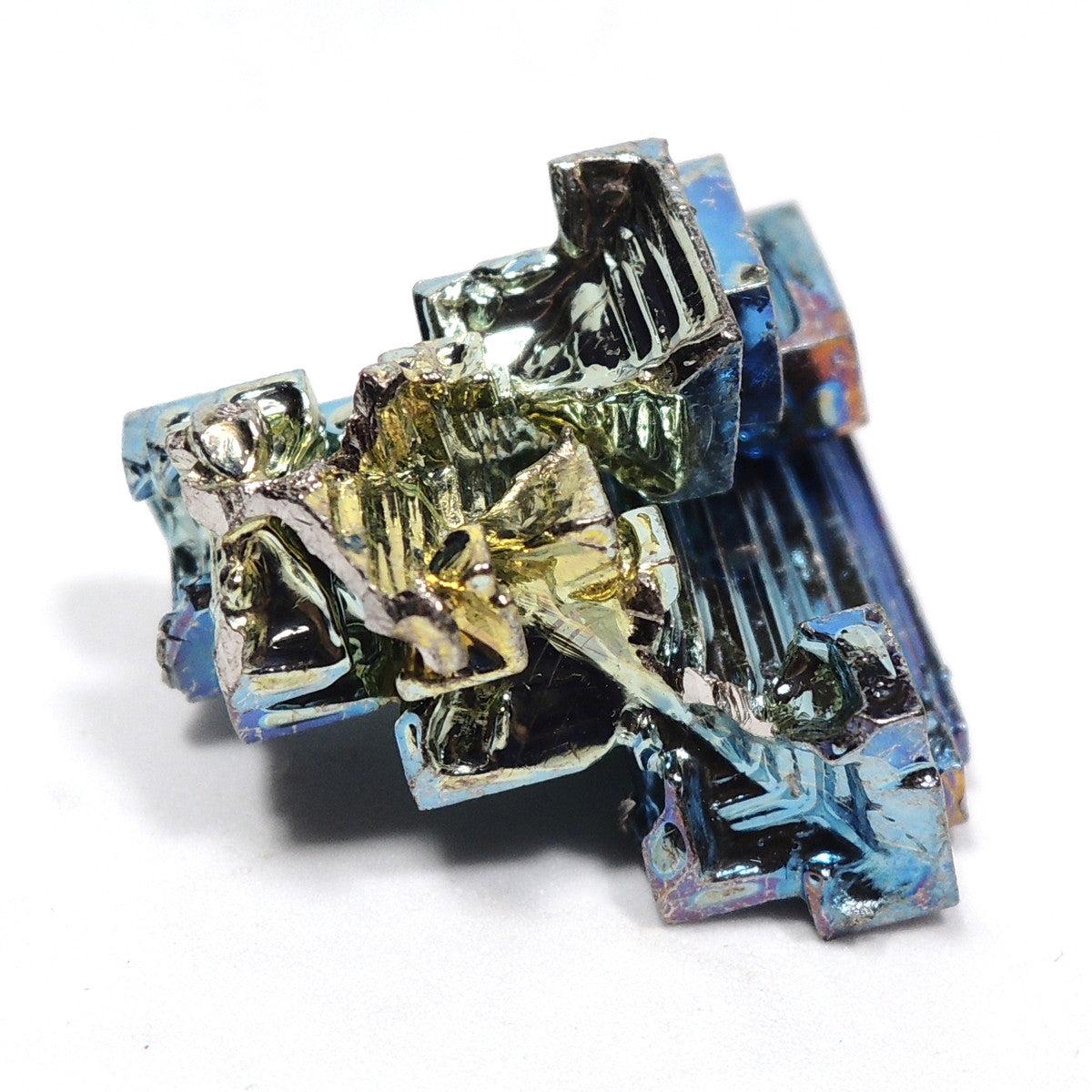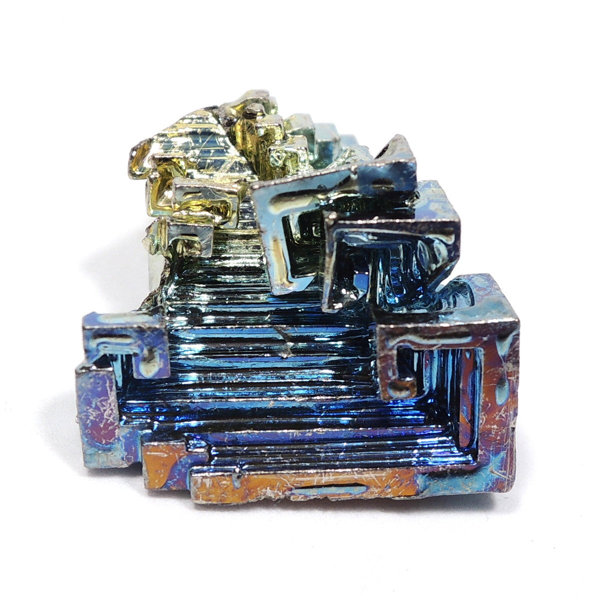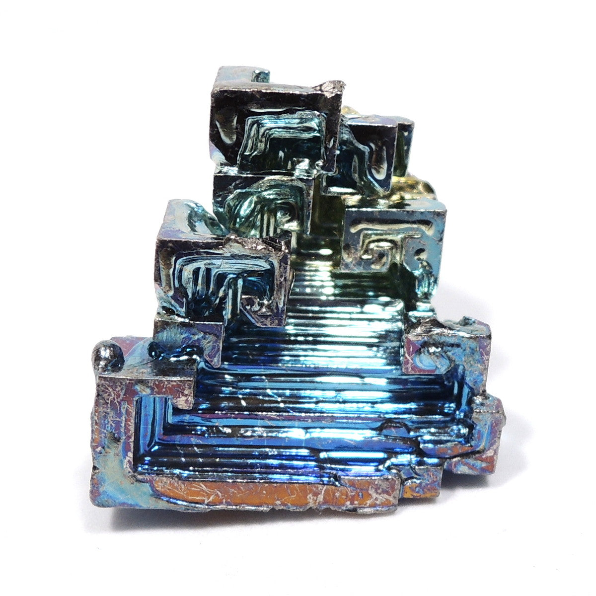 ビスマス(蒼鉛)はレアメタルの一種で、人工的に結晶化させたものは美しい色彩の酸化膜を有しています。
